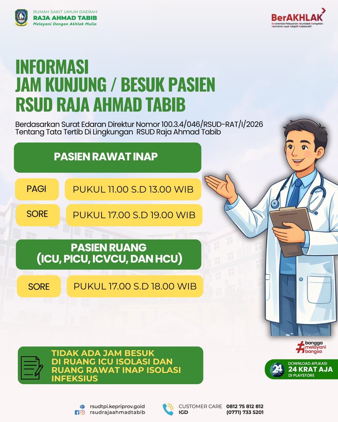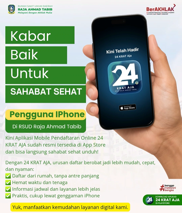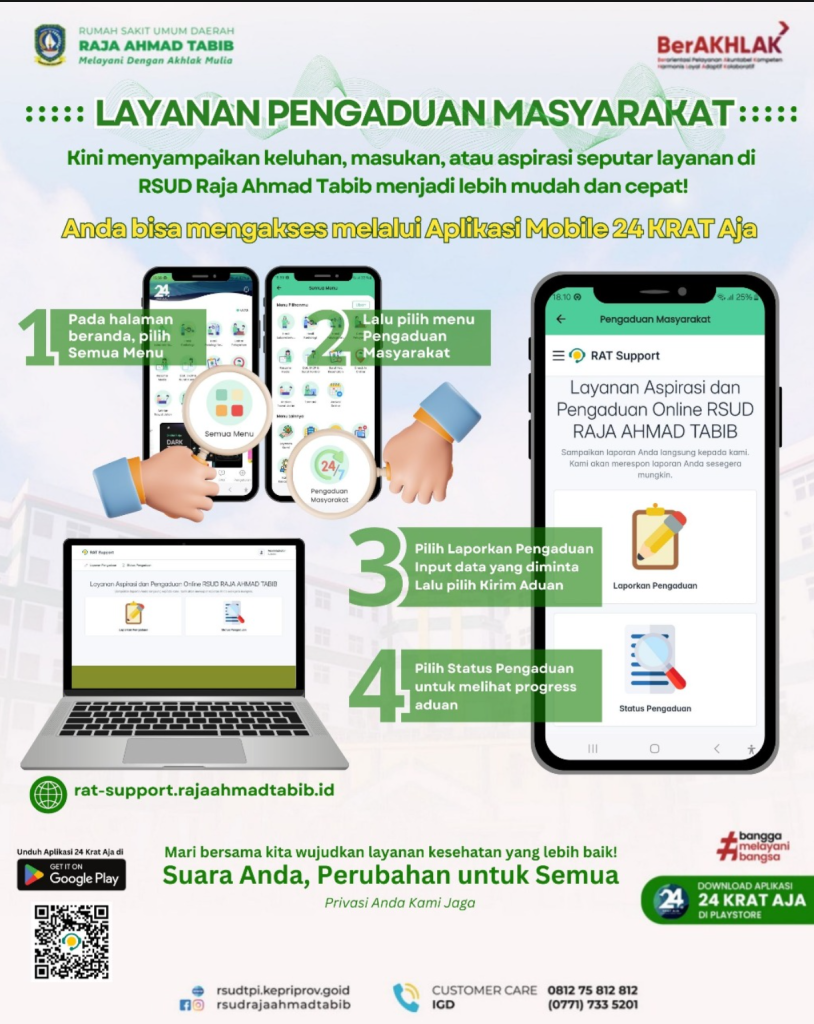 Kini, menyampaikan saran, kritik, atau keluhan terkait pelayanan di RSUD Raja Ahmad Tabib menjadi lebih mudah dan cepat lewat Layanan Pengaduan Digital di aplikasi 24 KRAT AJA.