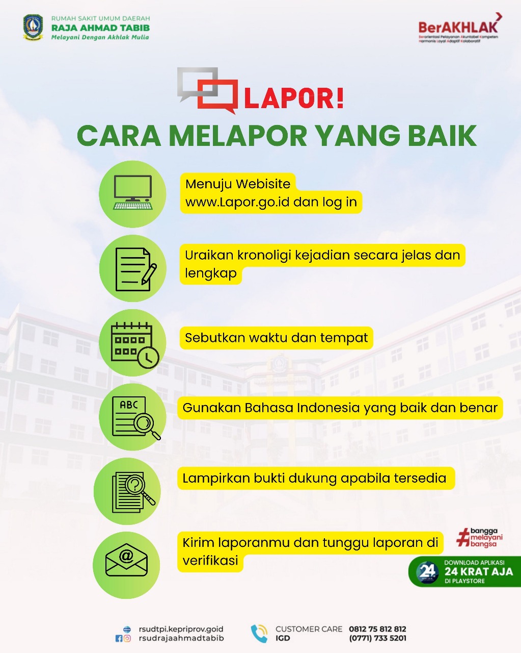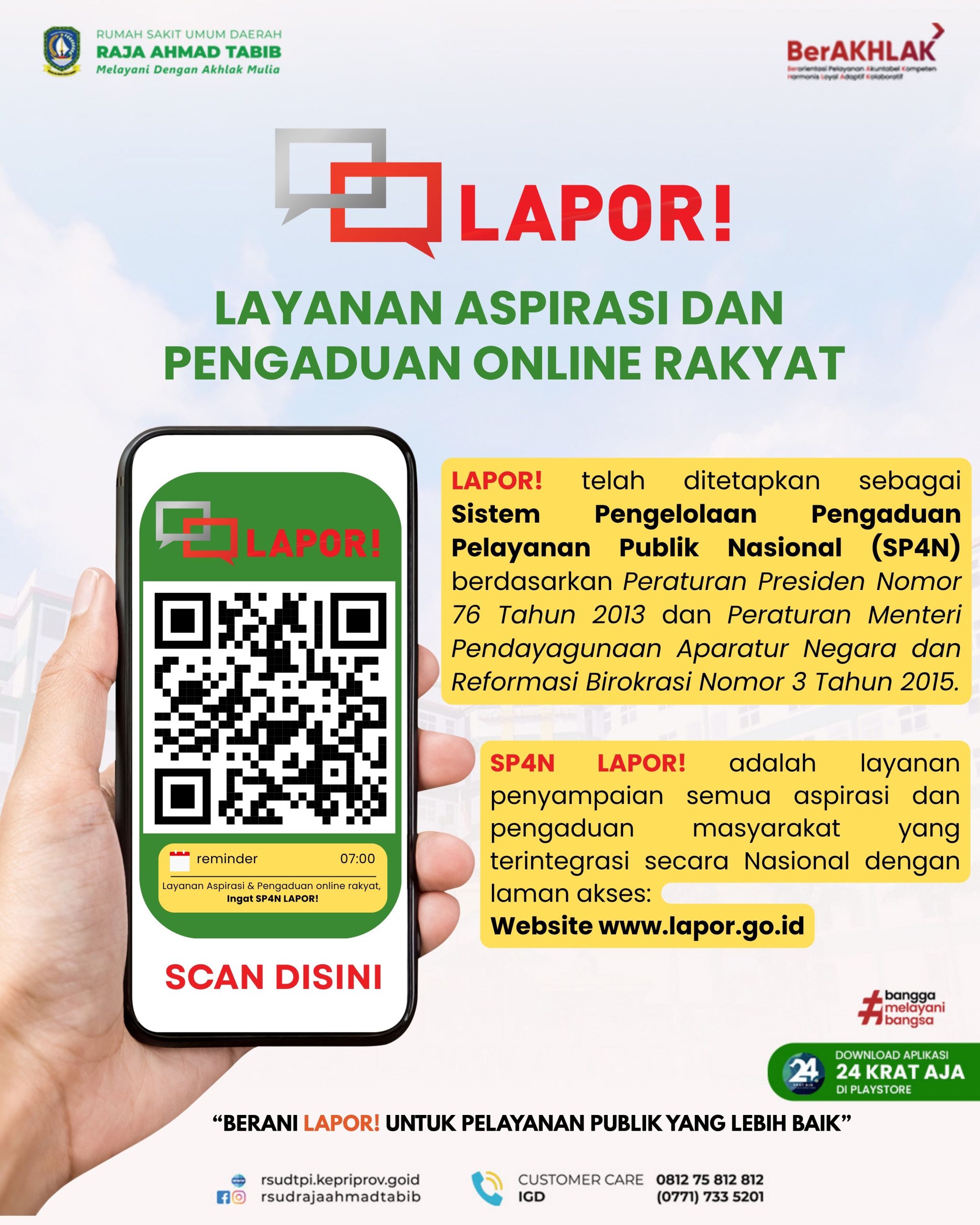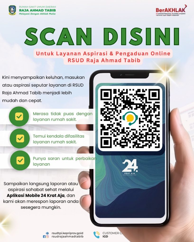 Di RSUD Raja Ahmad Tabib, kami berkomitmen untuk terus meningkatkan kualitas layanan. Suara, masukan, dan keluhan Anda adalah bagian penting dari proses evaluasi kami. Untuk itu, kami menyediakan beberapa kanal resmi yang mudah diakses untuk menyampaikan aspirasi dan pengaduan Anda.