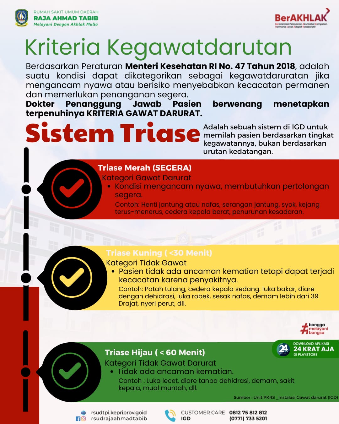 Memahami urgensi tersebut, Instalasi Gawat Darurat (IGD) RSUD Raja Ahmad Tabib berkomitmen untuk terus menghadirkan pelayanan cepat dan tepat, sesuai dengan standar yang telah ditetapkan pemerintah. Masyarakat dihimbau agar tidak ragu segera datang ke IGD jika mengalami kondisi yang masuk dalam kriteria kegawatdaruratan, dan mempercayakan penanganannya kepada tim medis yang siaga selama 24 jam penuh, tutup dr. Bambang. (Sumber: Informasi & Pemasaran)