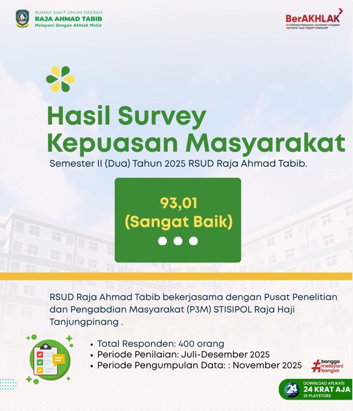 RSUD Raja Ahmad Tabib bertujuan untuk mengetahui tingkat kinerja unit pelayanan secara berkala sebagai bahan untuk menetapkan kebijakan dalam rangka peningkatan kualitas pelayanan publik selanjutnya bagi masyarakat serta memberi gambaran tentang kinerja pelayanan. Dibawah ini adalah grafik hasil survei terhadap kualitas pelayanan di RSUD Raja Ahmad Tabib Provinsi Kepulauan Riau Tanjungpinang.